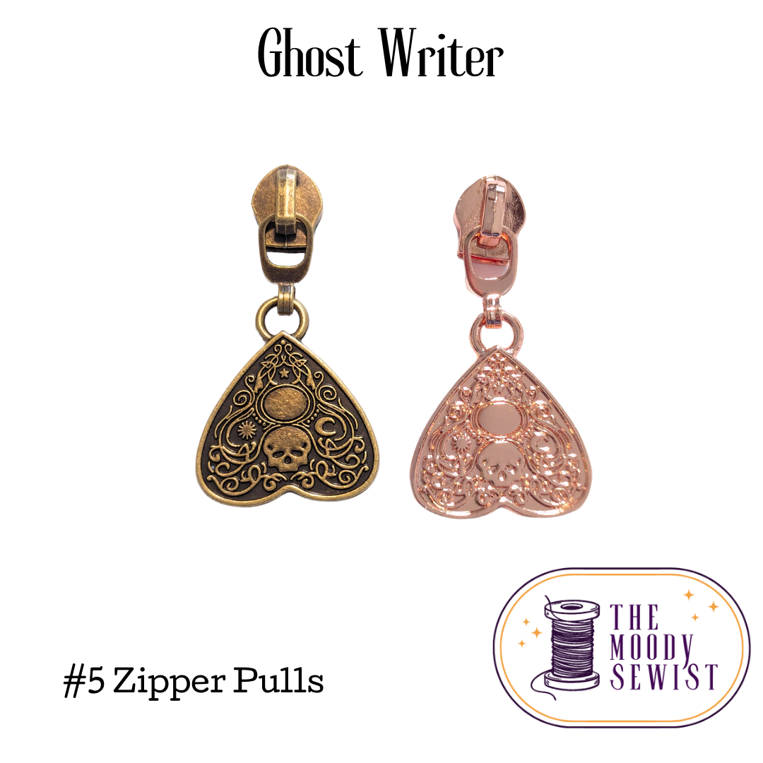 Summon some supernatural style with our Ghost Writer zipper pulls. Shaped like planchettes, these other worldly pulls add a touch of mystique to your designs. Whether you're a full blown witch or medium, or just into the spooky vibes, these pulls are sure to capture the attention of someone [dead or alive].