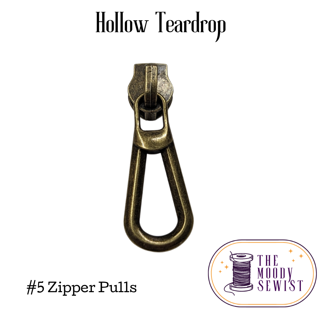 Hollow Teardrop pulls are big chonkers, perfect for handbags, backpacks, and duffels. They're 1.25" long exclusive of the zipper head. An edgier, modern take on the classic teardrop.