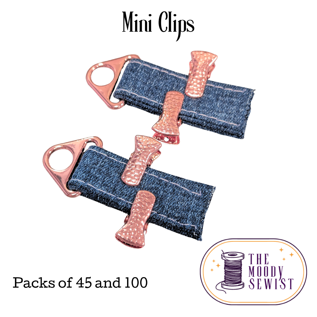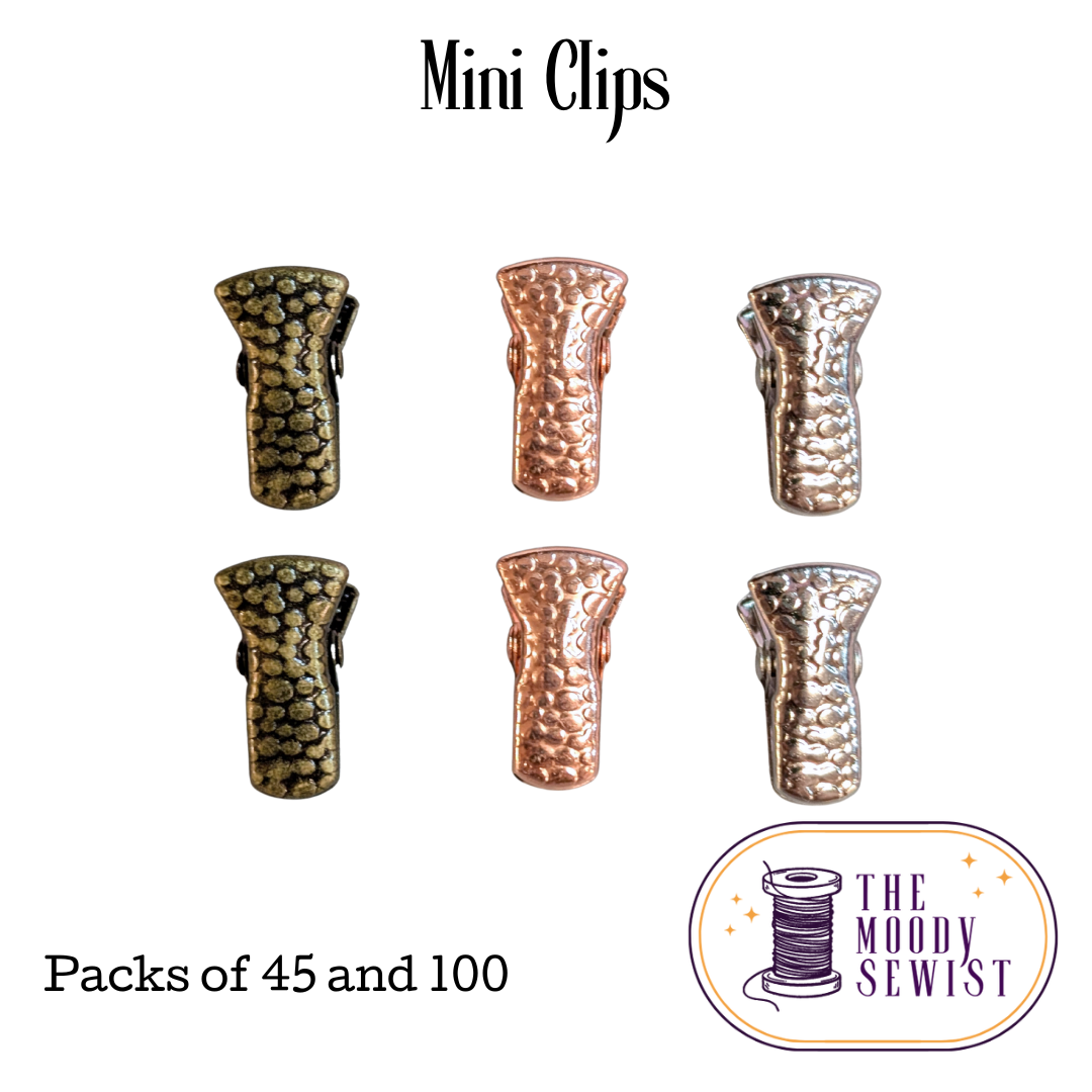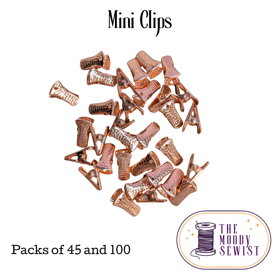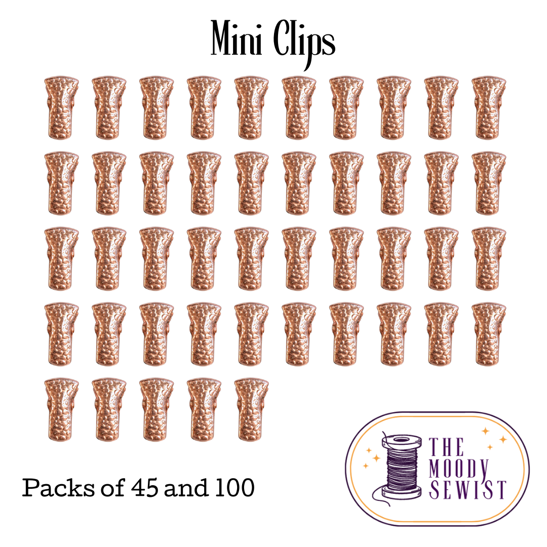 Mini Clips are your new sewing BFF. Small but mighty, they’re made with metal and a real spring for extra holding power, and they take up less space along your seam allowance, making them perfect for tight curves and precision work. Compared to plastic clips there's only one clear winner [and it comes in three finishes!] Available in Antique Bronze, Rose, Gold, or Silver finish.