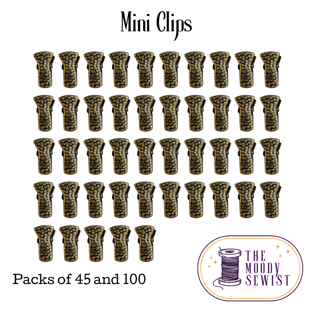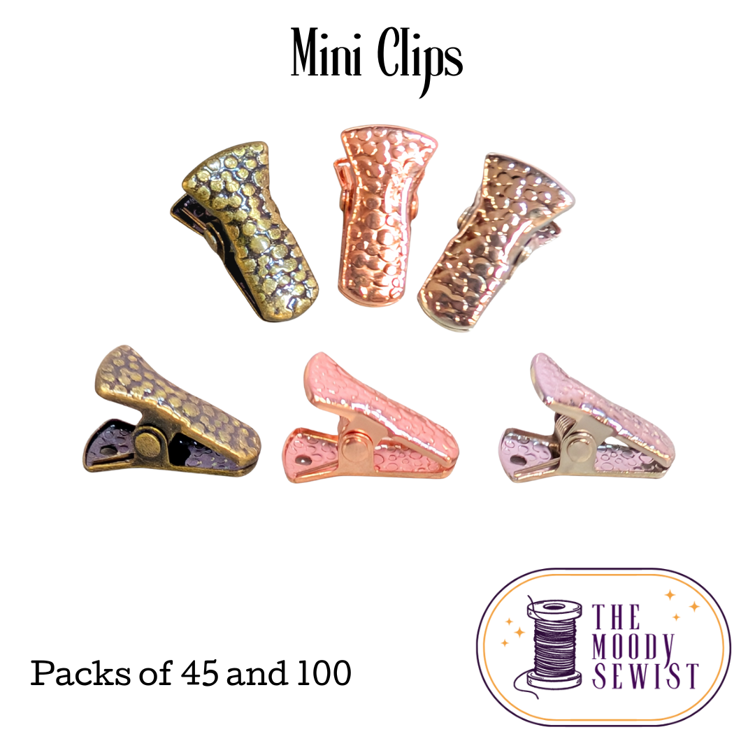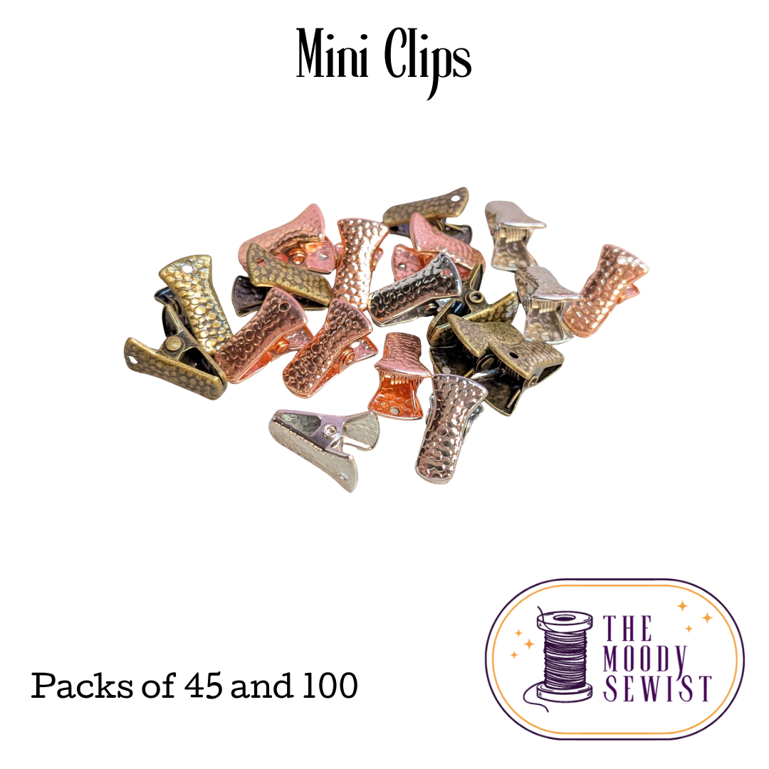 Mini Clips are your new sewing BFF. Small but mighty, they’re made with metal and a real spring for extra holding power, and they take up less space along your seam allowance, making them perfect for tight curves and precision work. Compared to plastic clips there's only one clear winner [and it comes in three finishes!] Available in Antique Bronze, Rose, Gold, or Silver finish.