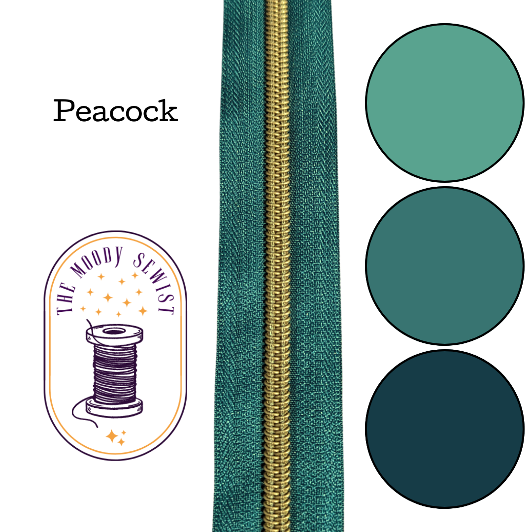 Peacock zipper tape is a vibrant green/blue, dark turquoise. It's a rich jewel tone that makes a statement!
