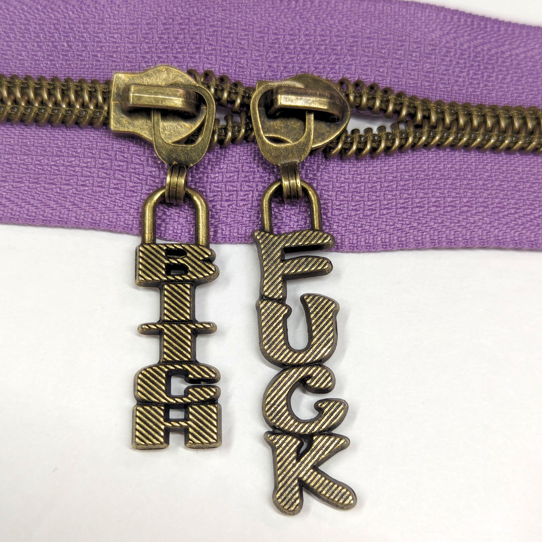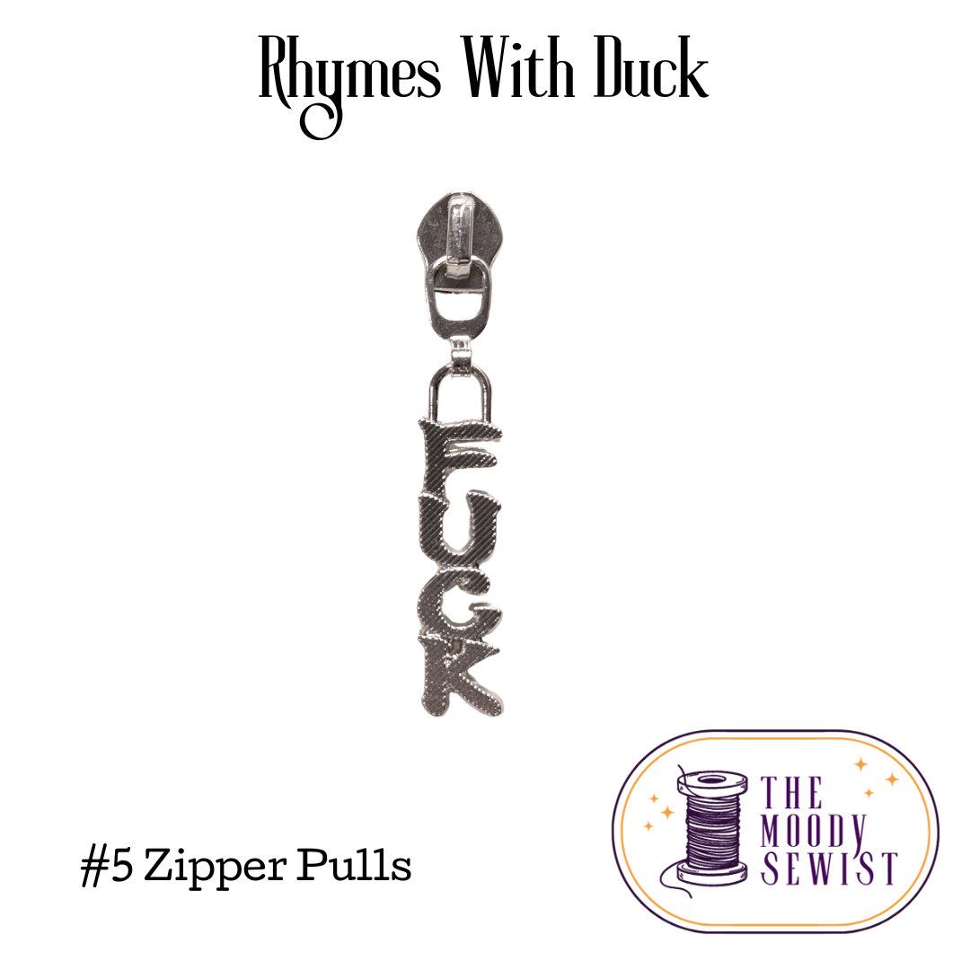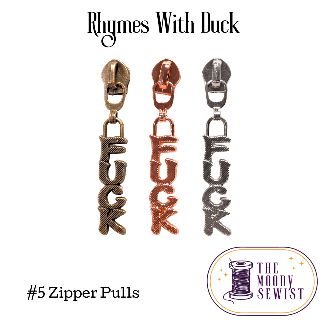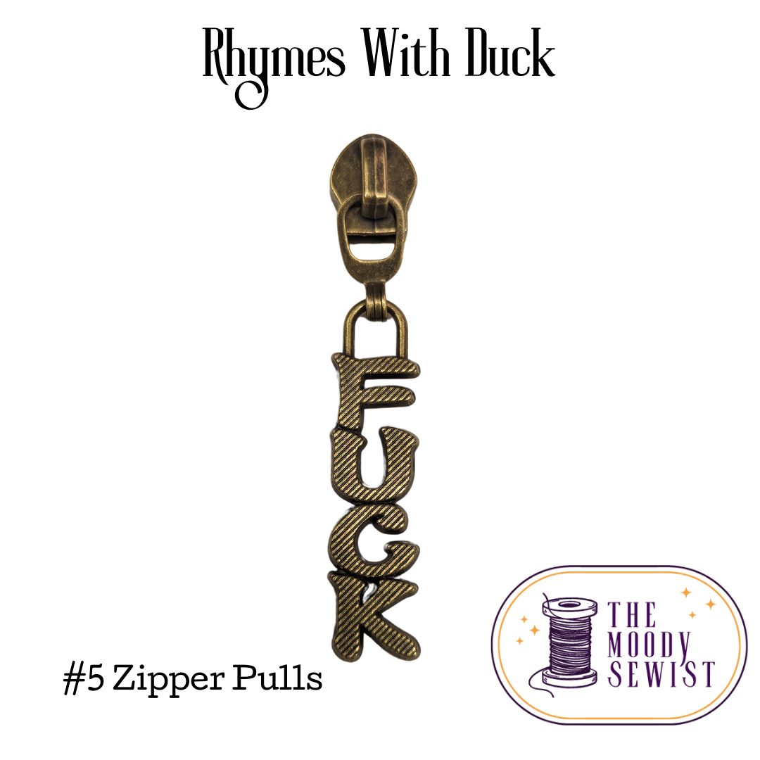 Say it loud, say it proud – it's our Rhymes With Duck zipper pull! In glorious antique bronze and elegant rose gold, this bold statement piece lets the world know you're not one to mince words. Stack up those letters vertically and let your zipper pull shout what's really on your mind. Unapologetically snarky, moody, and bold, it's the ultimate zipper pull that says what you're really thinking.