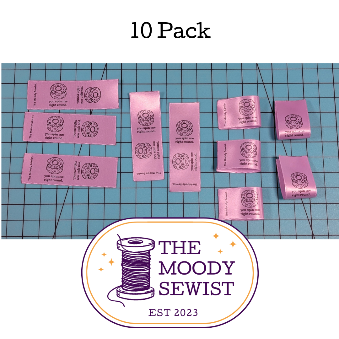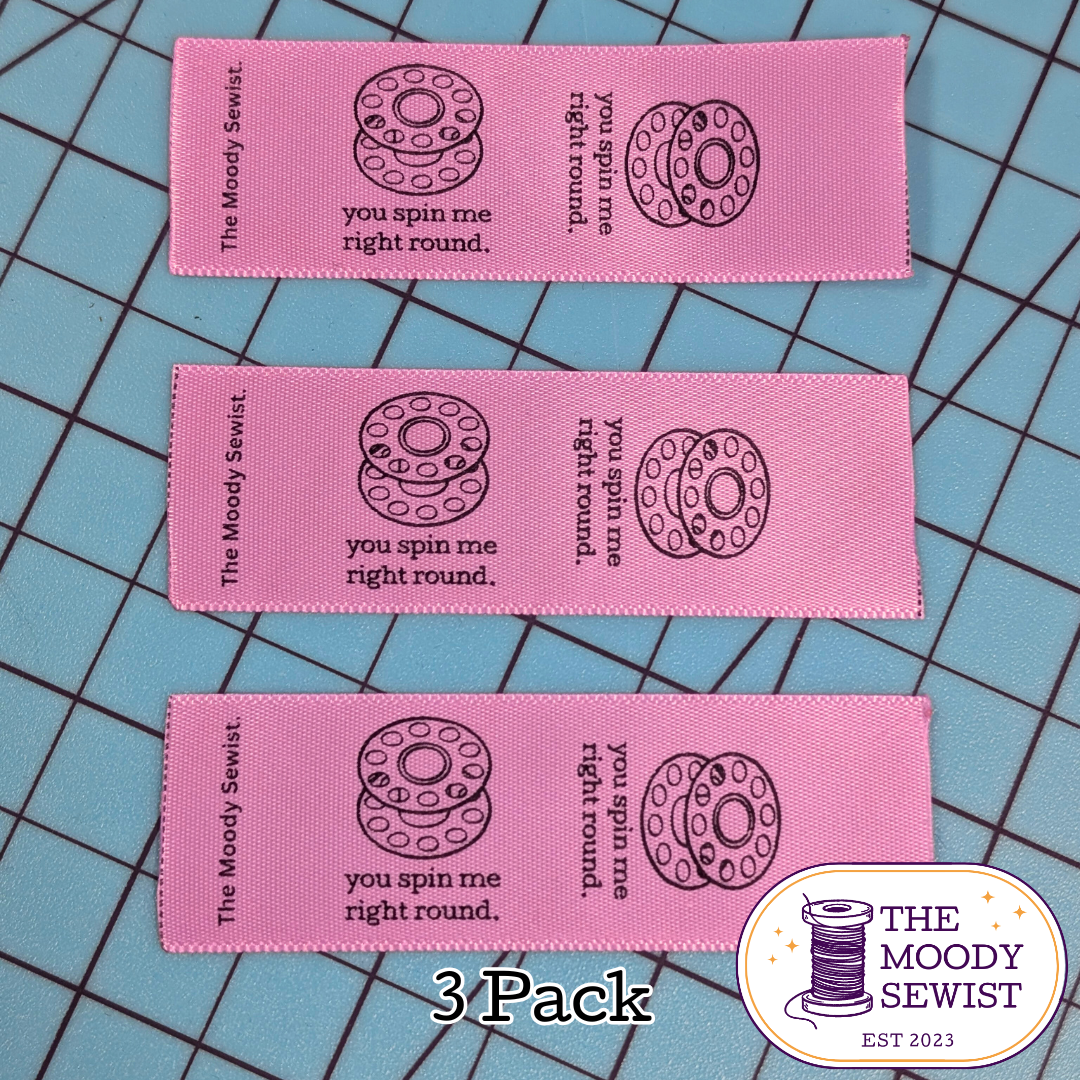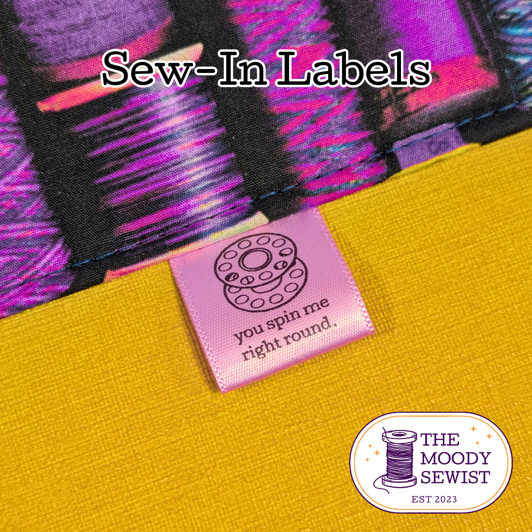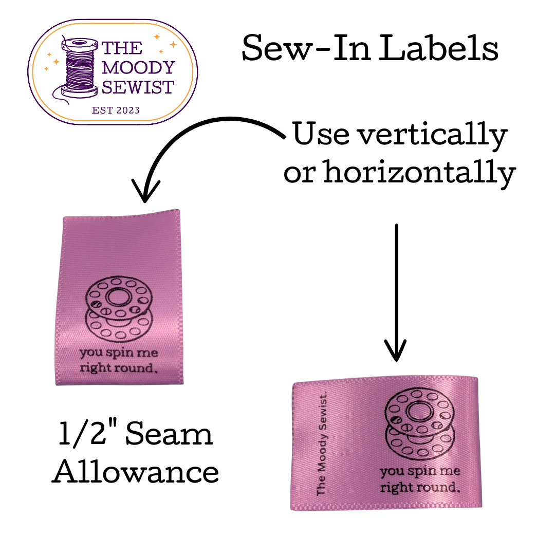 Add a touch of personality (and a healthy dose of pun) to your handmade creations with this cheeky satin sew-in label featuring a spinning bobbin and the playful phrase: "You Spin Me Right Round." Whether you're stitching up clothing, bags, quilts, or accessories, this label puts a fun spin on your finishing touches.
