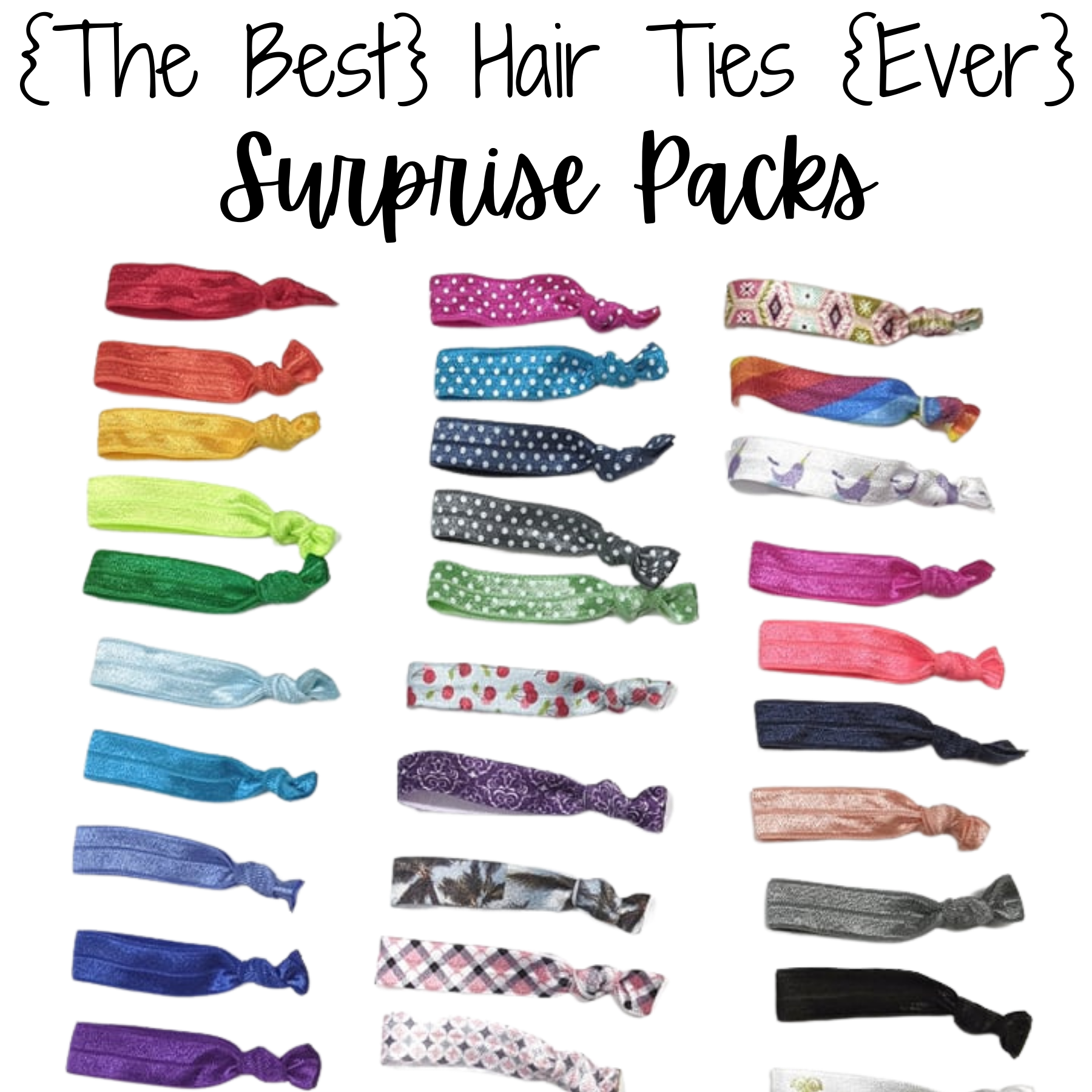This listing is for 4, 8, or 20 mystery hair ties in a mix of solids and prints. 4 Packs come on a card, 8 and 20 packs are packaged in a compostable and recyclable paper bag.