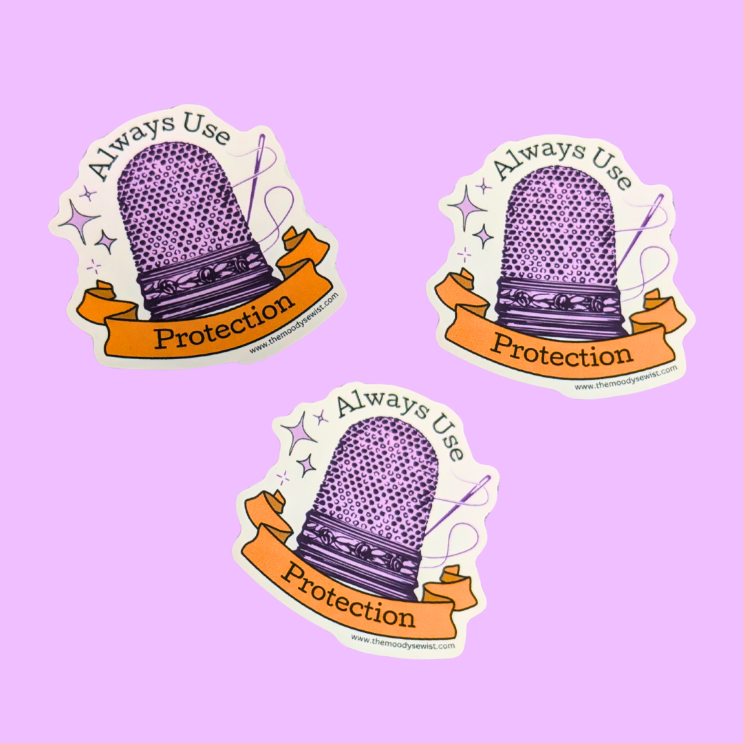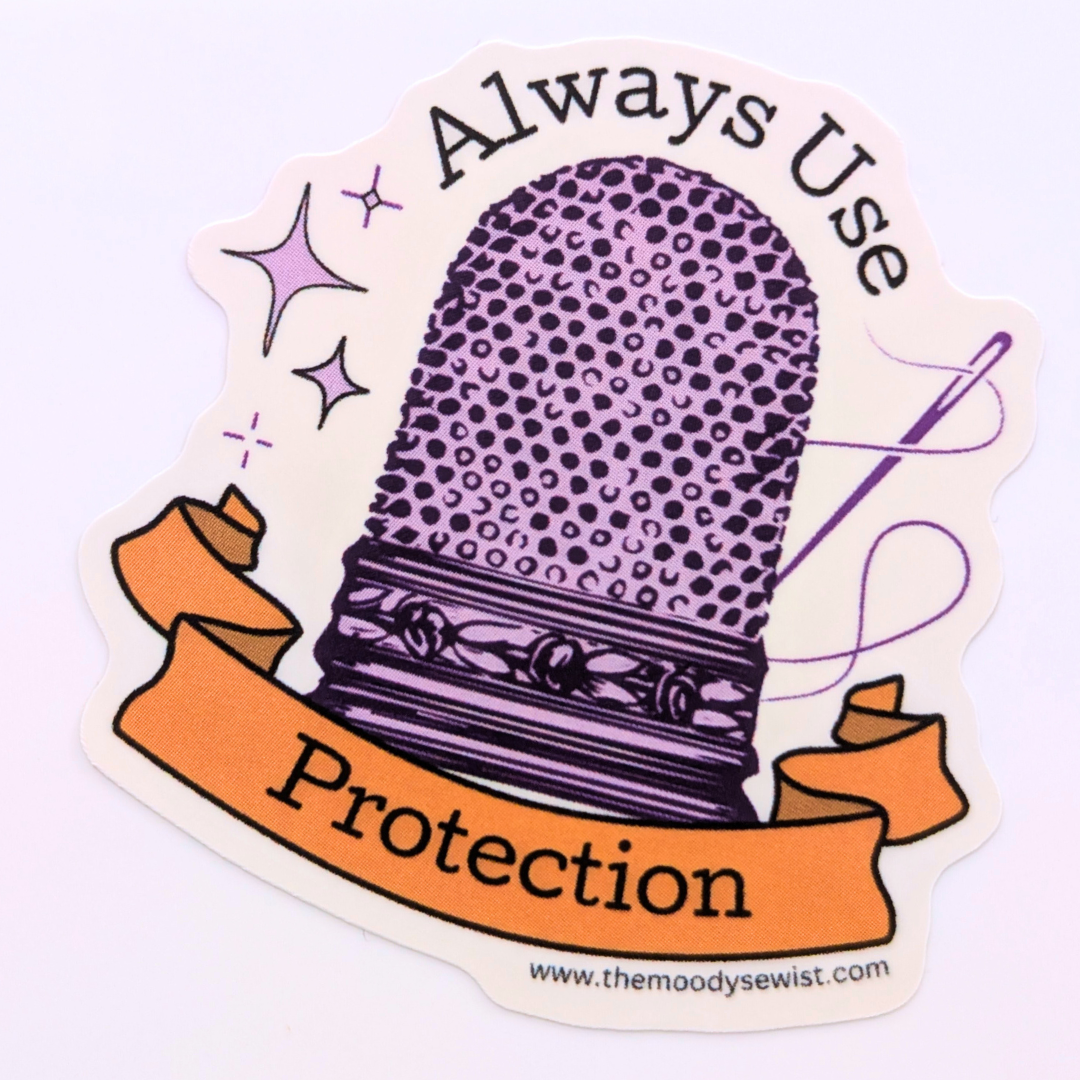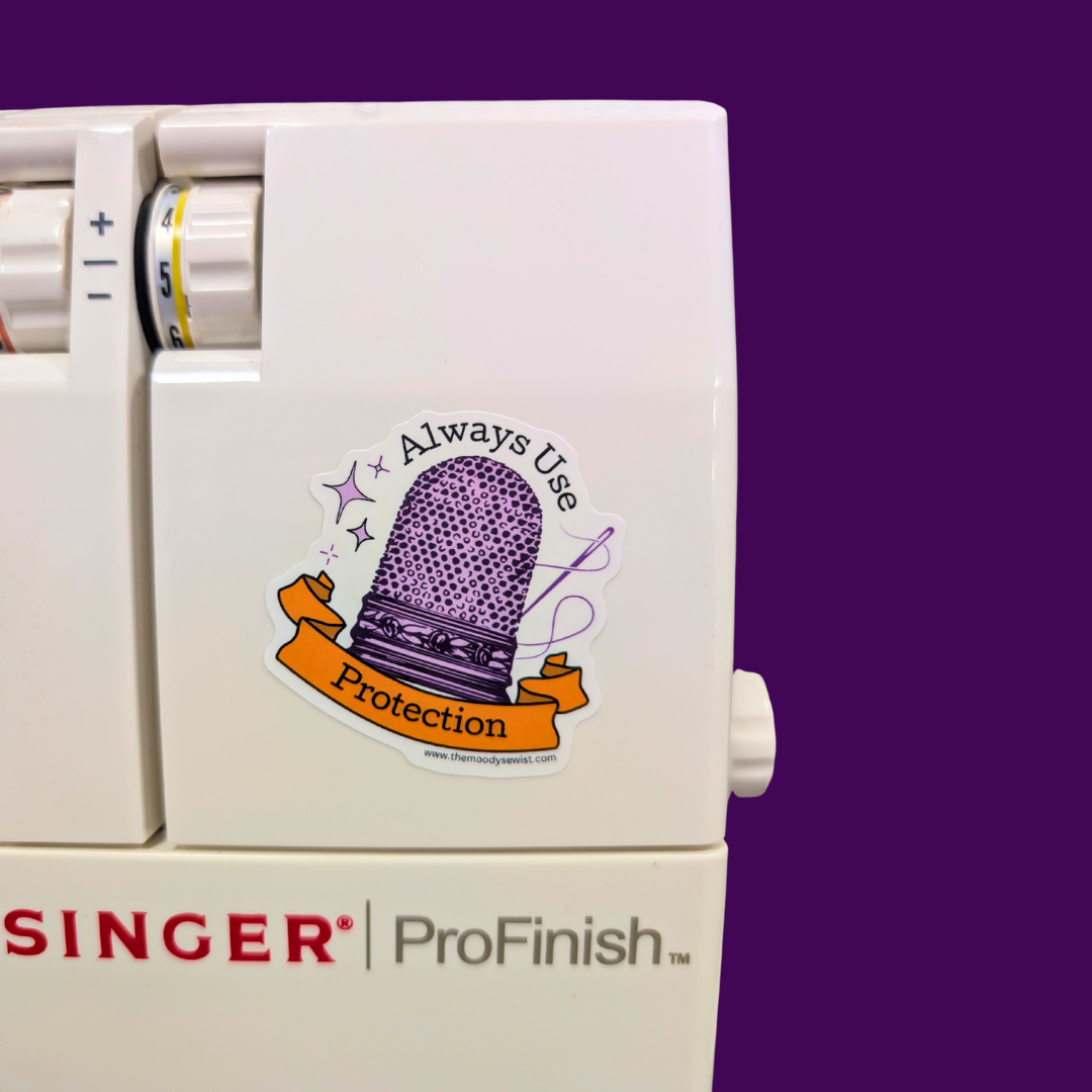 A little naughty, a lot necessary. This matte vinyl sticker is here to keep things safe and spicy. Featuring a classic thimble and needle with the bold reminder: "Always Use Protection," it’s the perfect way to dress up your sewing machine while delivering a super serious PSA.
