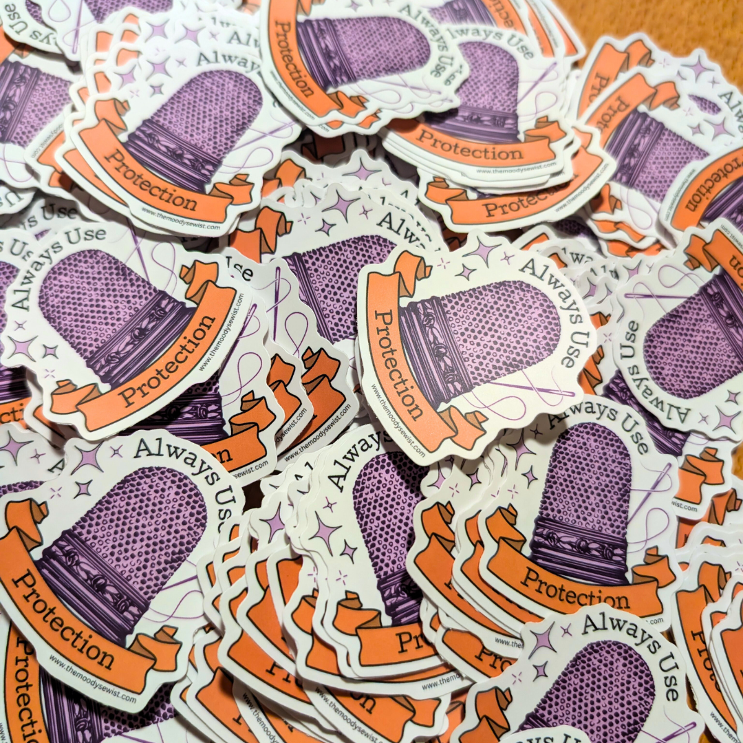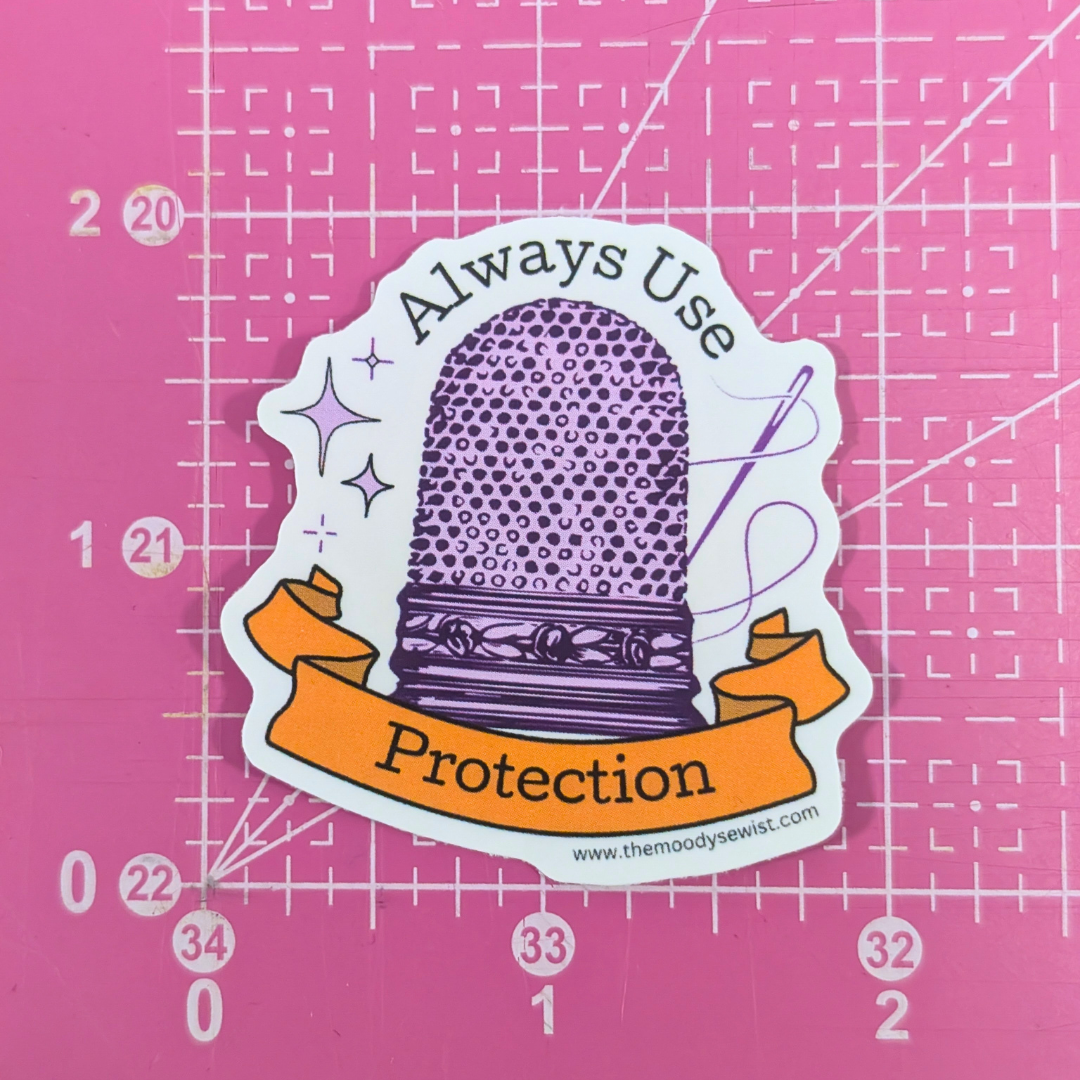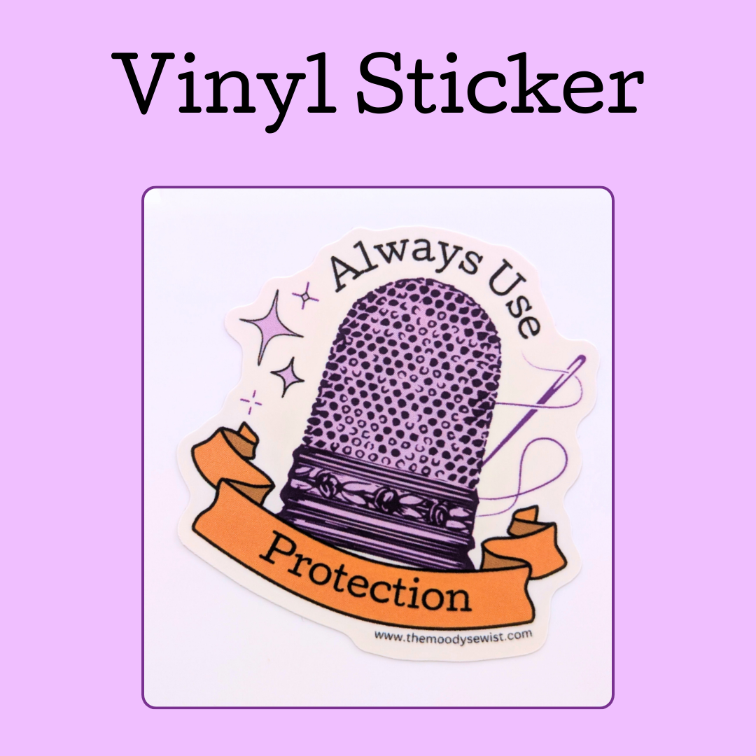 A little naughty, a lot necessary. This matte vinyl sticker is here to keep things safe and spicy. Featuring a classic thimble and needle with the bold reminder: "Always Use Protection," it’s the perfect way to dress up your sewing machine while delivering a super serious PSA.