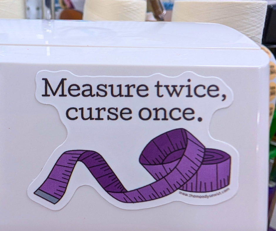With a smooth matte finish and a strong adhesive, this vinyl sticker is perfect for your sewing machine, rotary cutter case, water bottle, laptop, or wherever you need a little reminder that you're not alone in your cutting woes.